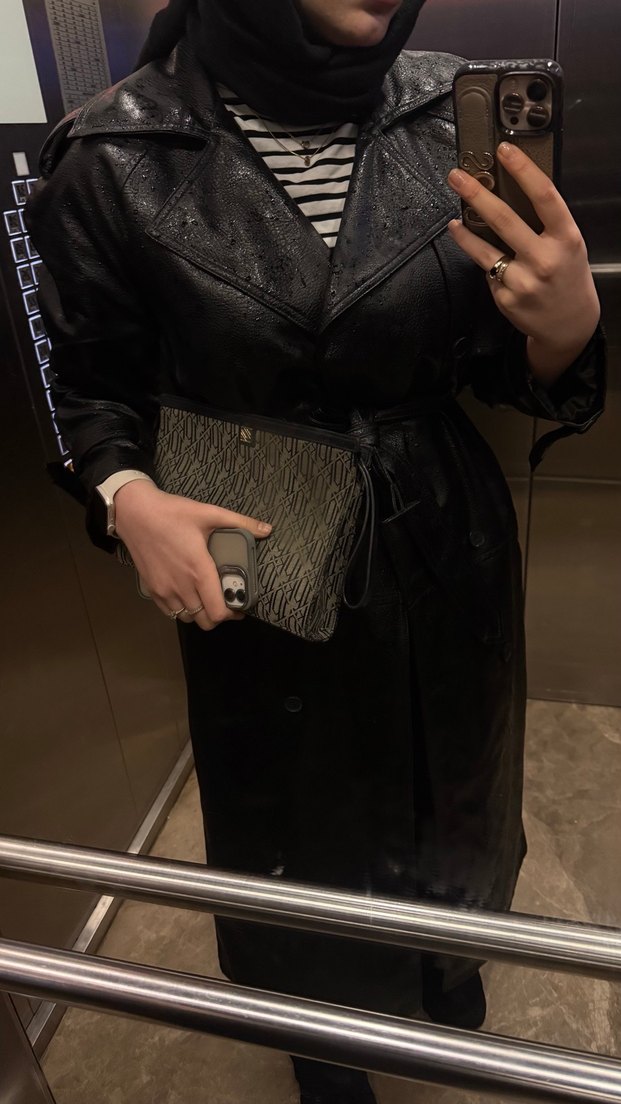 Siyah deri trençkot, kemerli ve rahat bir kalıba sahiptir. askılı kollara sahiptir, günlük şık sokak tarzı için uygundur.