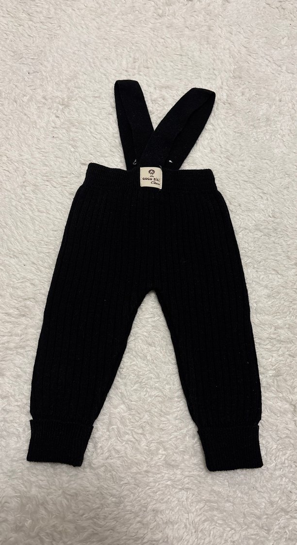 Yumuşak triko kumaştan yapılmış, siyah askılı ve dar kesim erkek bebek tulumu. Sade, normcore tarzda.