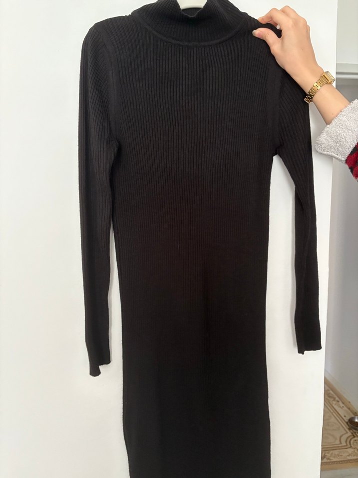 Siyah boğazlı ve uzun kollu, vücuda oturan triko uzun elbise. Düz deseni ve yumuşak dokusu günlük rahat sokak stili için uygundur. Standart beden