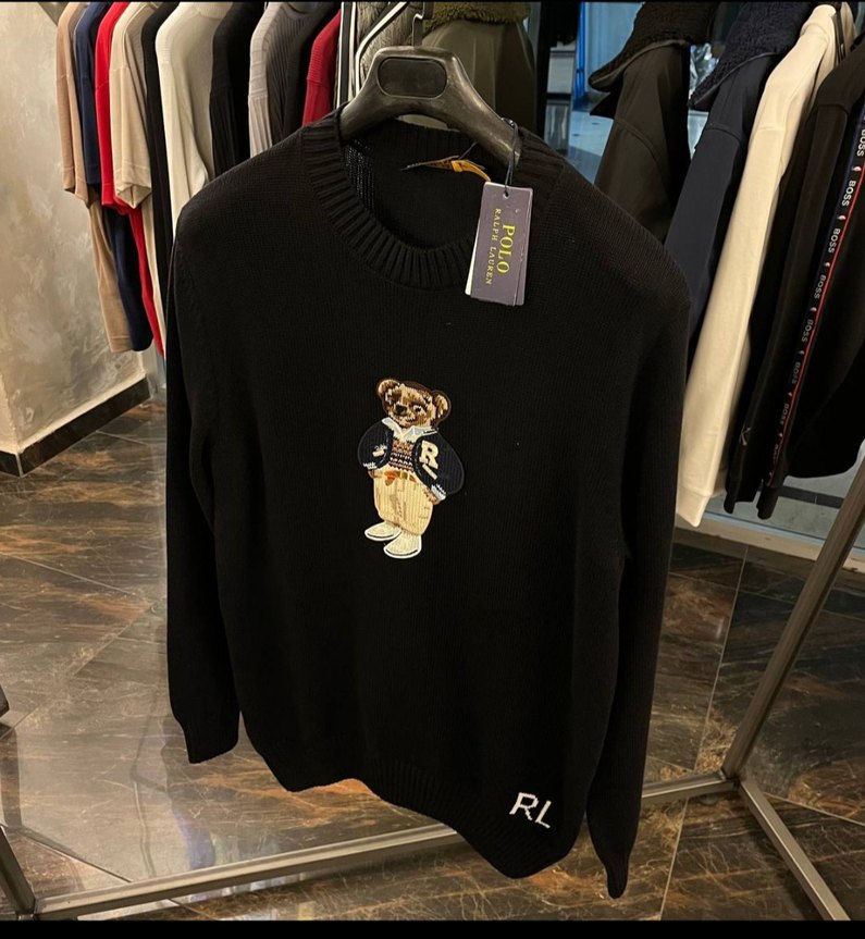 Siyah yün triko kazak, yuvarlak yaka ve uzun kolludur. Rahat kesim olup önünde baskılı ayıcık deseni ve "RL" nakışı vardır. Polo markasına aittir.