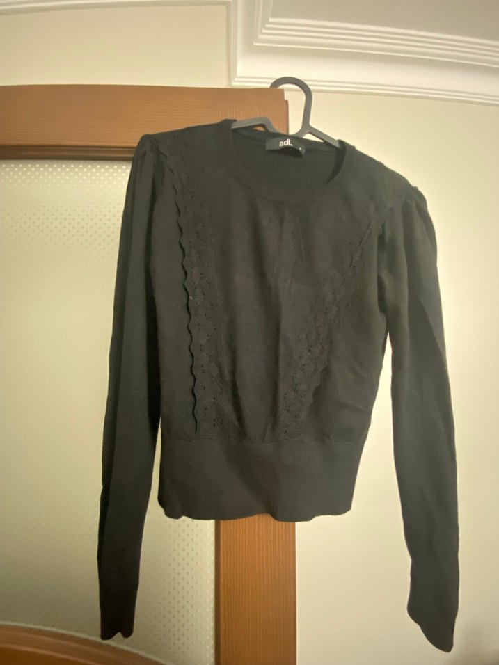 Siyah, triko kumaştan yapılmış, uzun kollu ve yuvarlak yakalı, vücuda oturan kadın kazak. Önde ince işlemeli detaylar bulunur, günlük şıklık için uygundur.