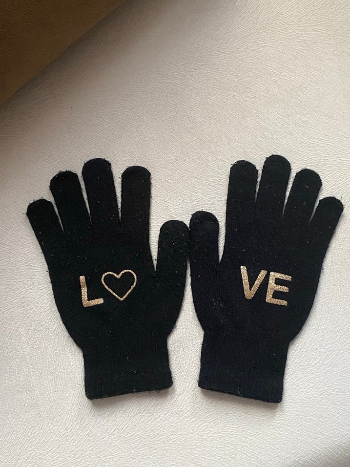 Siyah triko eldivenler, gotik tarzda "LOVE" yazısı ve kalp deseniyle. Trend belirleyiciler için şık ve rahat.