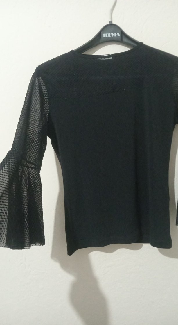 Örgü detaylı, yarı şeffaf uzun kollara ve bisiklet yaka sahip siyah, vücuda oturan gotik tarzda bluz. üstte xok şık duran urundur.yeni gibidir.s ve m bedene uygundur.