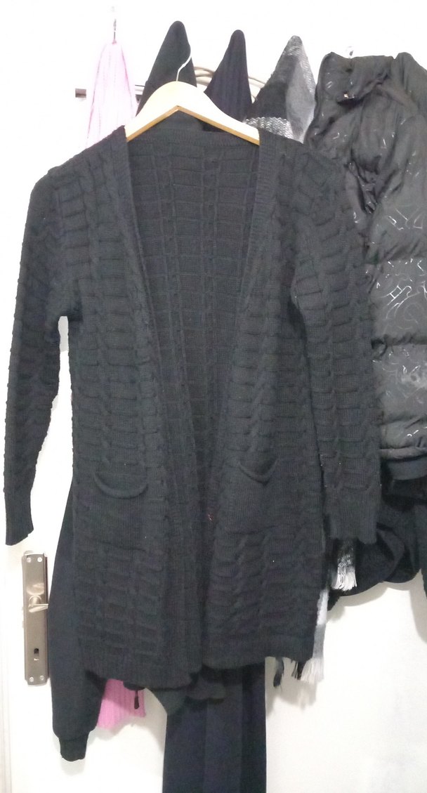 Siyah triko hırka, midi boy, uzun kollu ve kesimli. İki ön cepli, rahat ve şık bir günlük kullanıma uygundur. çok kullanmadım pazarlık olabilir
