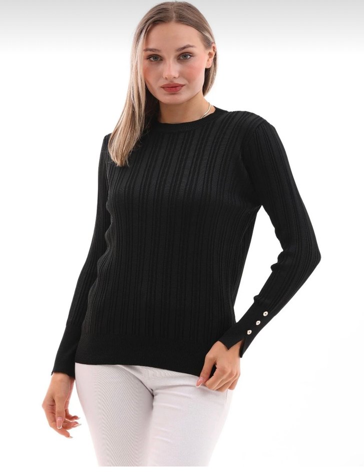 Bu siyah kazak, uzun kollu ve yuvarlak yakalıdır. Triko kumaştan yapılmış, normal kesim ve midi boydadır. Kolunda düğme detayları bulunur.
