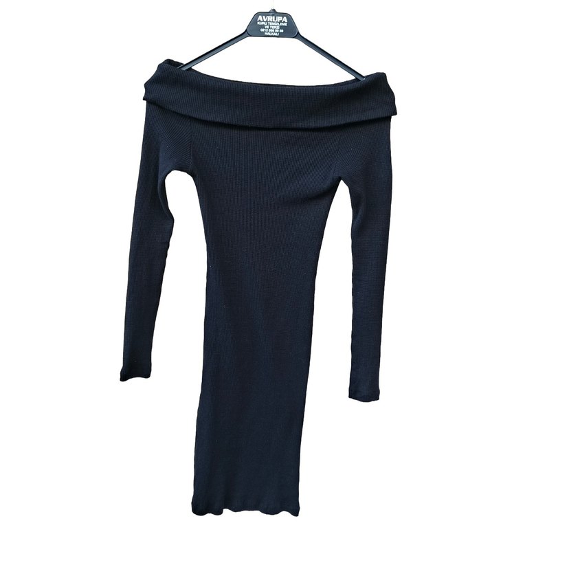 Siyah renkli, fitilli kumaştan yapılmış kadın midi boy elbise kayık yaka omuzdan yakalar vücudu sarar temiz defosuzdur