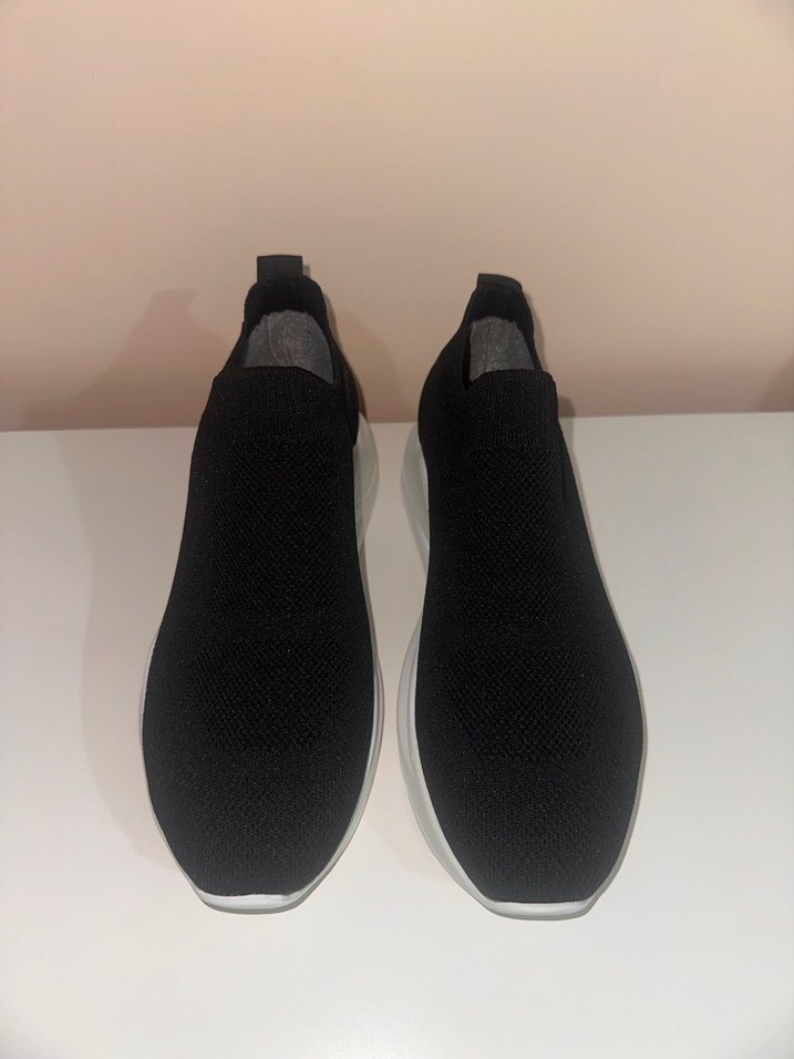 Siyah dolgu topuklu kadın spor ayakkabı, kauçuk tabanlı, günlük sokak stiline uygun sade ve zahmetsiz şıklık sunar.