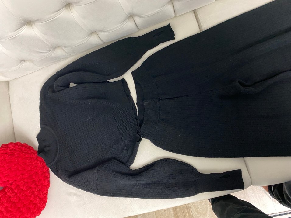 Siyah, triko dokulu, keten kumaştan yapılmış, uzun kollu ve yakası kesimli, midi boyda, vücuda oturan kadın hırka ve triko pantolon . Rahat ve şık normcore tarzda, günlük kullanım için uygundur. Bellı olmadığı için flaslı çektim ılk fotoyu