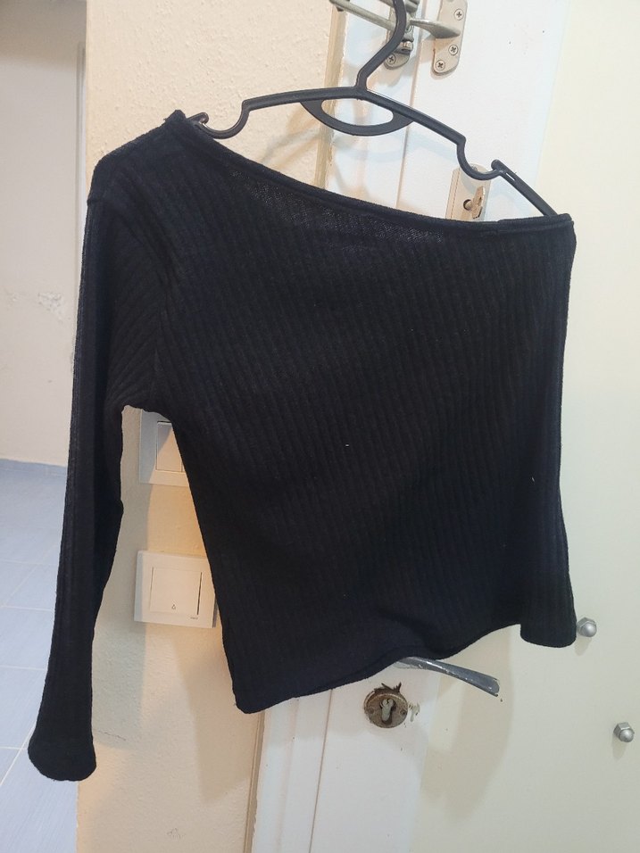 Bu siyah triko kadın kazak, tek omuz kesimi ve uzun kollu tasarımıyla minimalist goth tarzını yansıtıyor. Orta boy uzunluğu ve dar kesimiyle trend bir görünüm sunar.