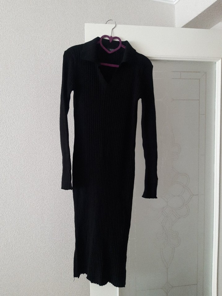 Bu siyah uzun elbise, yakalı ve uzun kollu olup örgü sentetik kumaştan yapılmıştır, gotik tarzda ve dar kesimdir. elastan yapisi vardir
