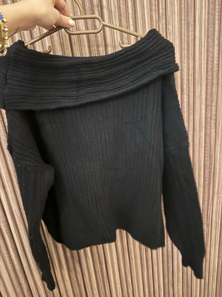 Siyah renkte, kayık yaka ve uzun kollu triko kadın kazak. Rahat kesimi ve midi boyuyla gündelik kullanıma uygundur.