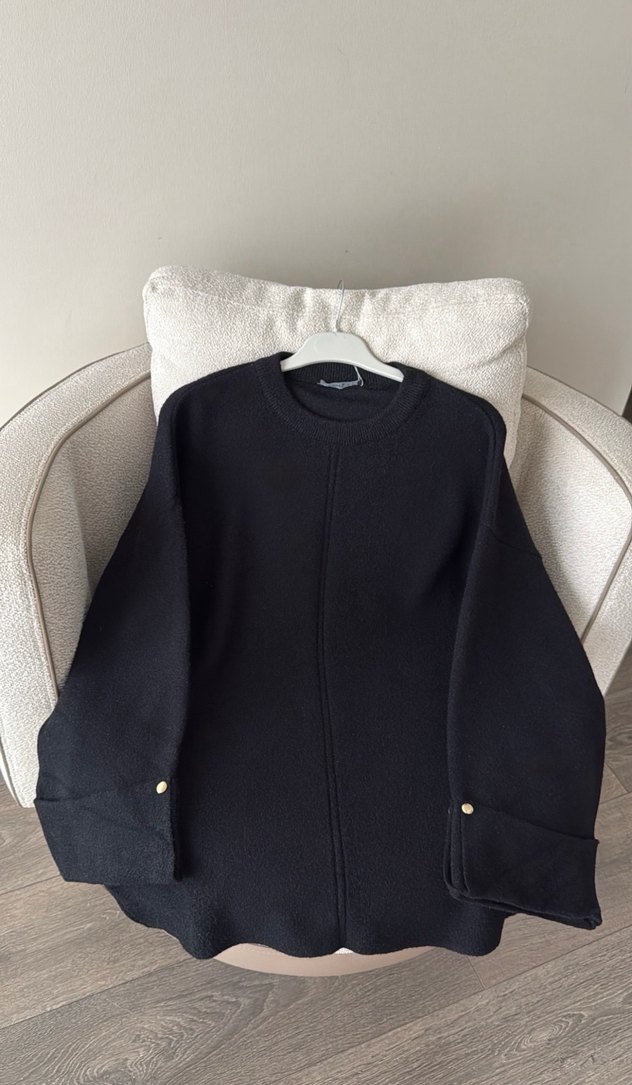 Siyah triko kazak, yuvarlak yaka ve düğmeli uzun kollara sahiptir. Rahat kesimli ve normal boyda, yumuşak tüylü kumaştandır.