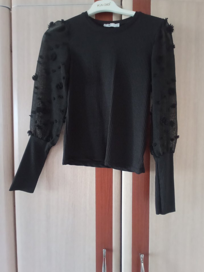 Siyah, triko uzun kollu ve ponpon detaylı, kısa kesim, ince oturan kadın bluz. Yuvarlak yaka ve gündelik kullanıma uygun goth tarzı.