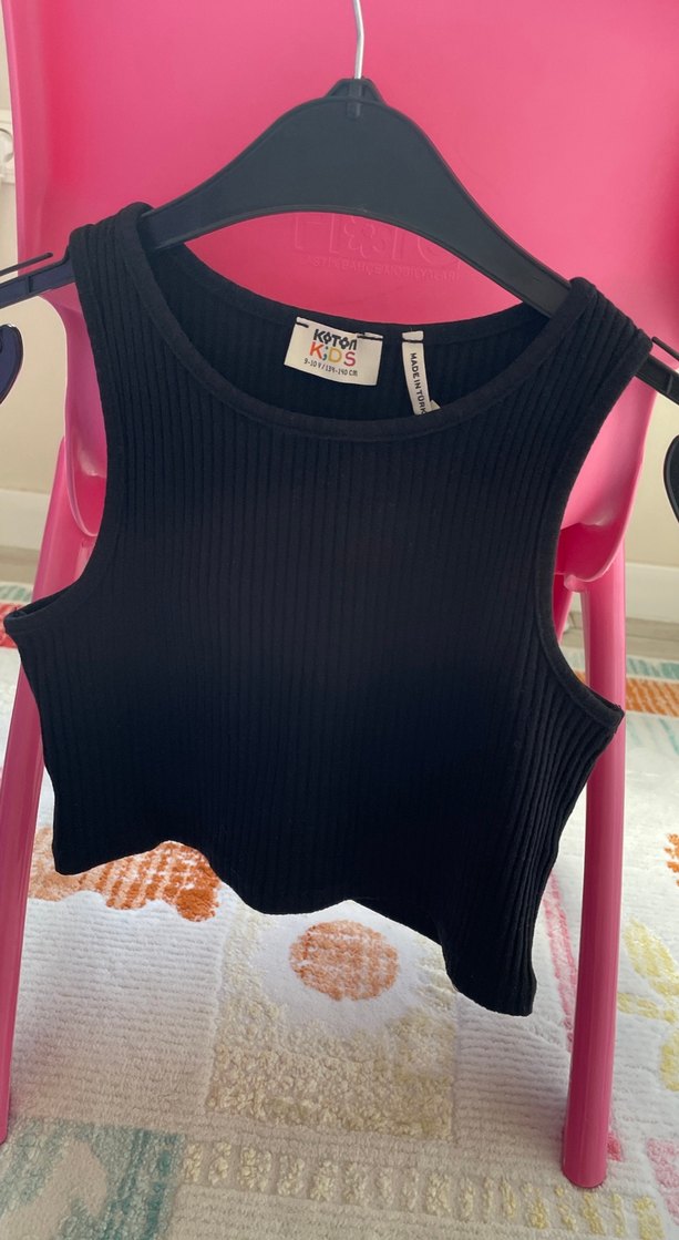 Siyah kolsuz crop top, triko dokulu ve fitted kesimlidir. Yuvarlak yaka ve kısa boyuyla günlük sokak stili için uygundur.