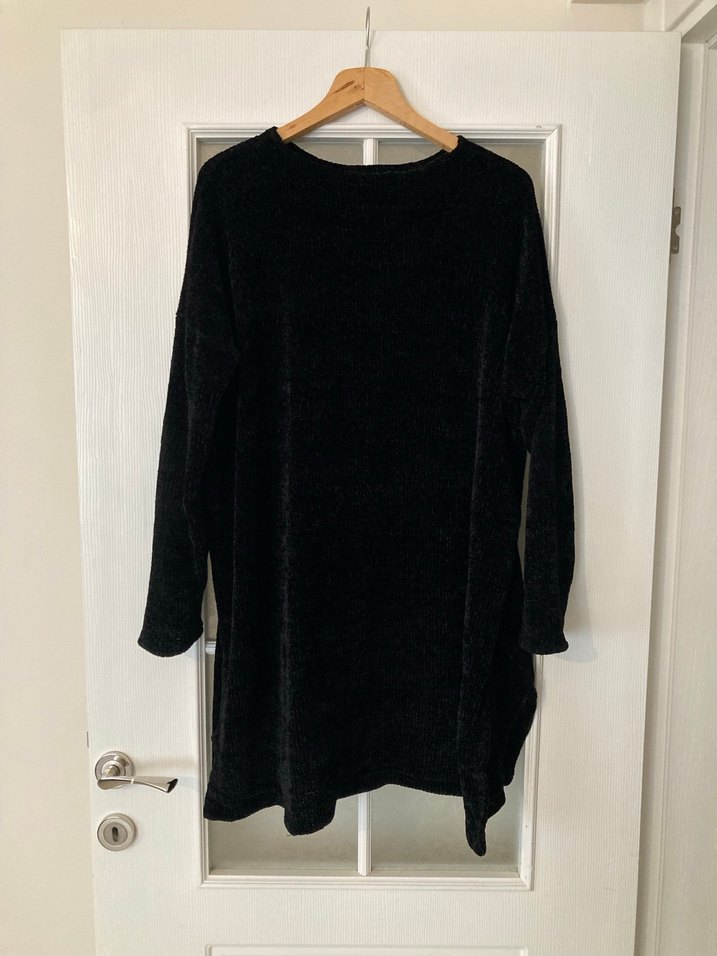 Bu siyah triko keten tunik, uzun kollu, yuvarlak yakalı ve bol kesimli panço modeldir, midi boydadır. Günlük kullanıma uygun, rahat ve gotik tarzda bir üründür.