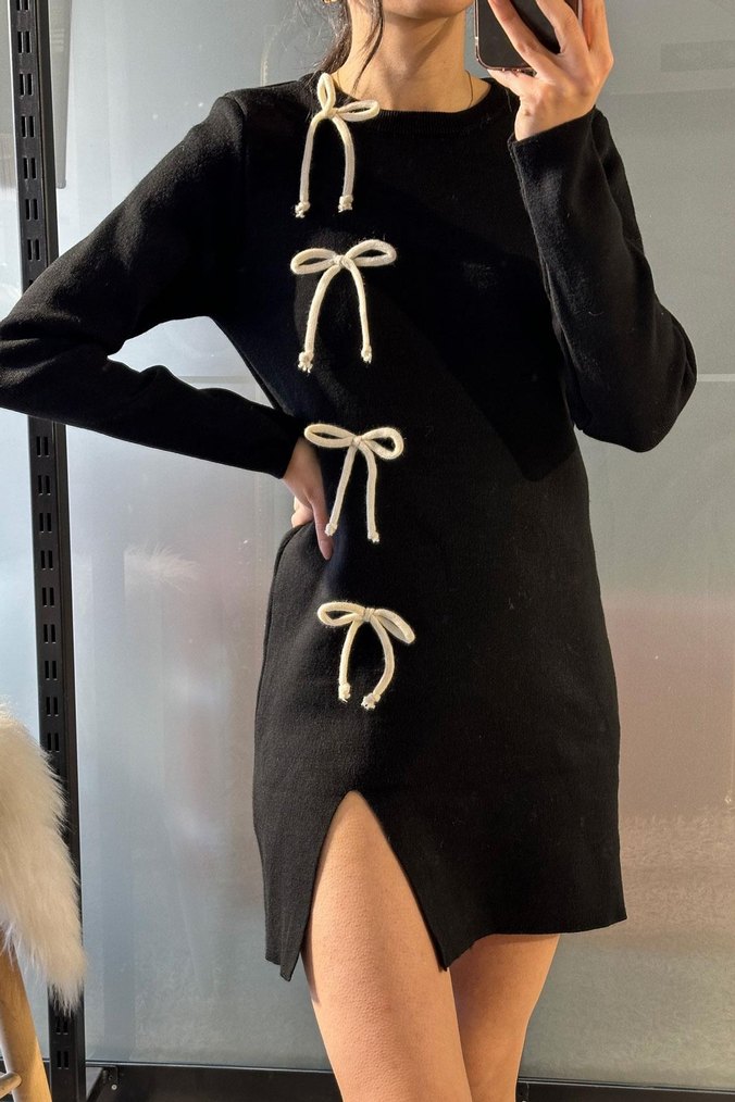 Siyah triko kumaştan, uzun kollu ve dar kesim bir elbise. Nakışlı fiyonk detayları ve ön yırtmaç ile günlük kullanıma uygun.