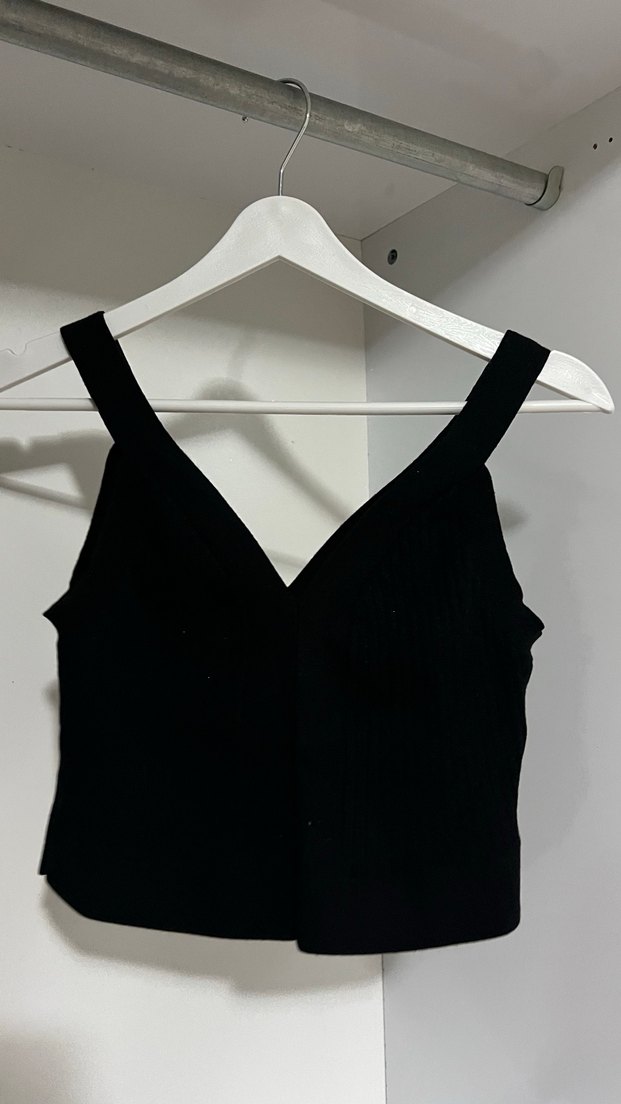 siyah triko mini uzunlukta, V yakalı ve kolsuz, vücuda oturan kadın atlet. Minimalist gotik tarz için uygundur.