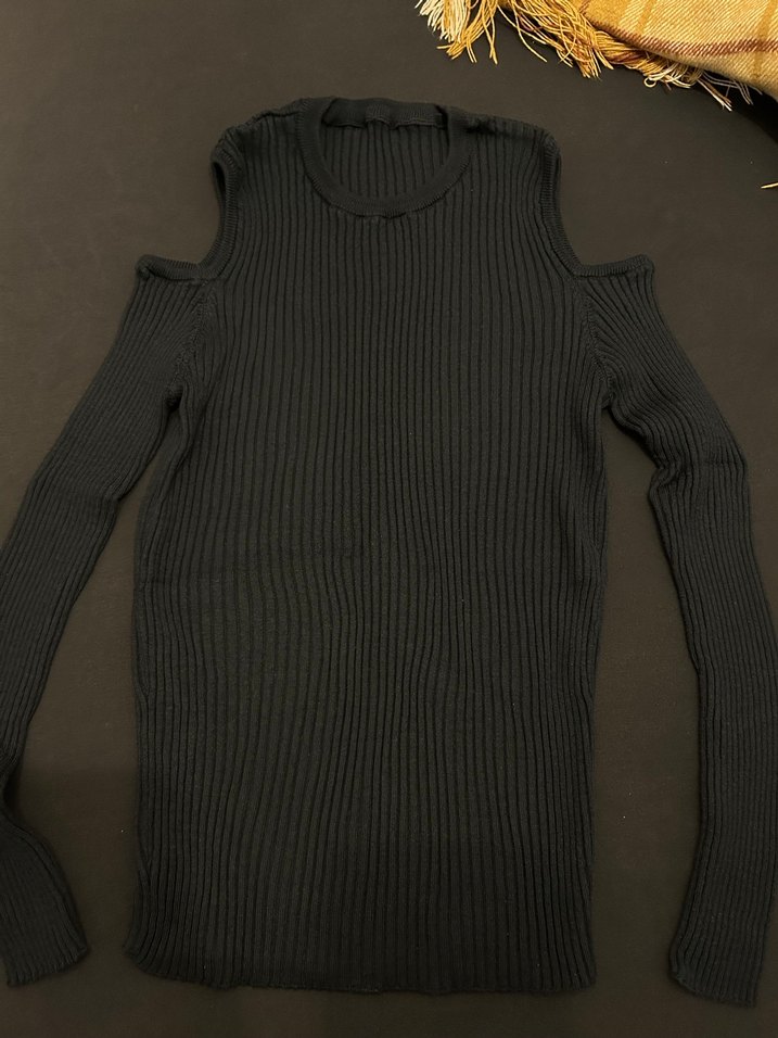 Siyah triko kumaştan, uzun kollu ve omuzları açık detaylı, midi boy ve dar kesim kadın kazak. Günlük rahat stil için uygundur.