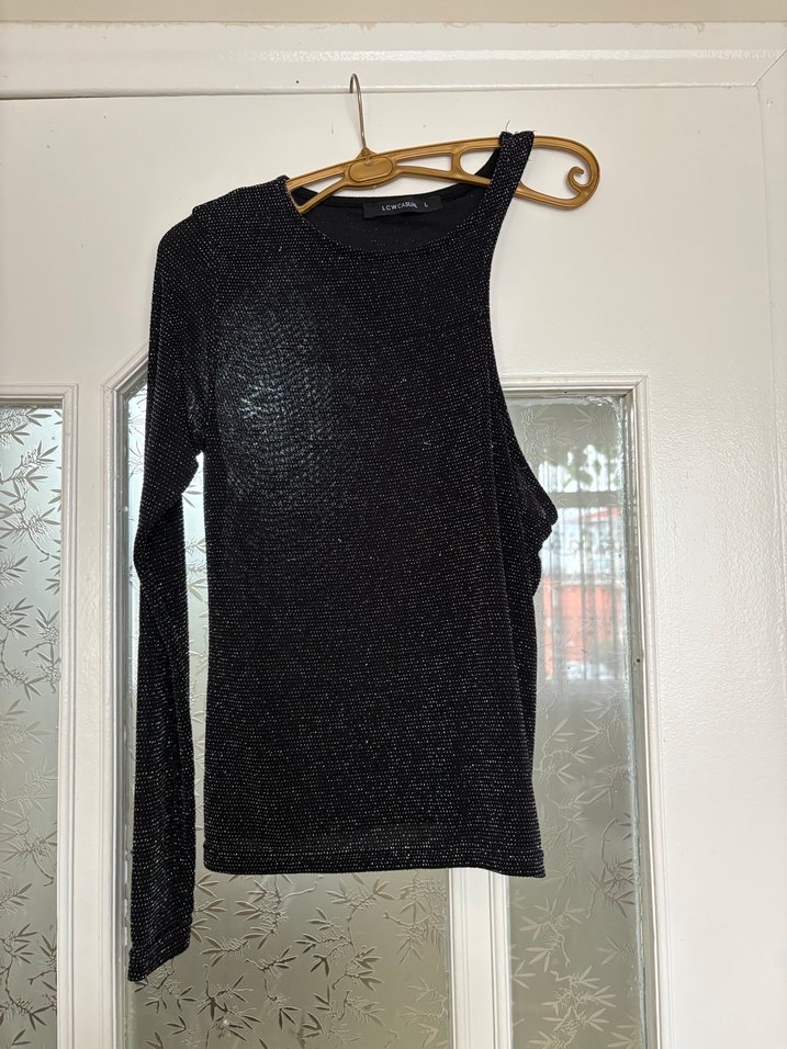 Dar kesim siyah bluz, triko dokusu ve tek uzun kolu ile modern bir sokak stili sunar. Yuvarlak yakalı ve normal boydadır, sentetik kumaştan üretilmiştir.