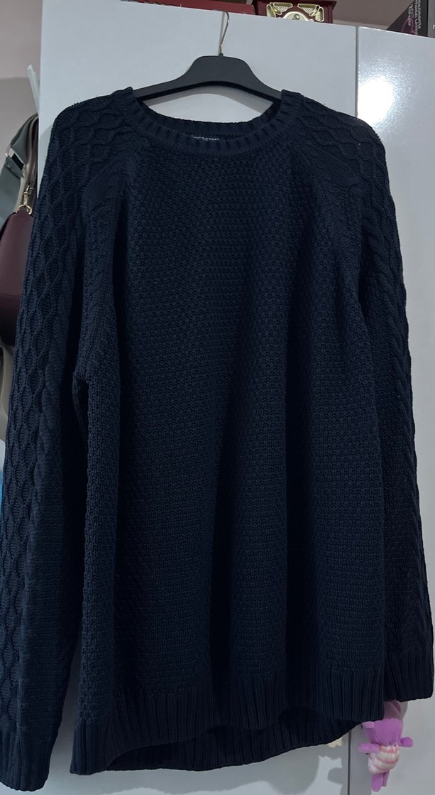 Siyah triko kumaştan, yuvarlak yaka ve uzun kollu, bol kesim rahat ve günlük kullanıma uygun kadın/erkek kazak. Boyu 78 eni 65