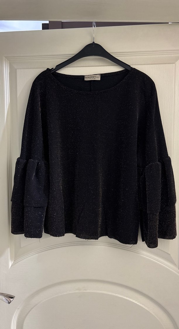 Siyah renkli, yumuşak yün kumaştan örülmüş, uzun kollu ve yuvarlak yakalı, bol kesim bir bluz.