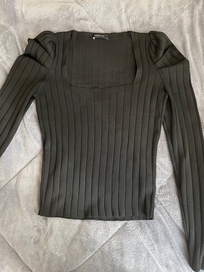Dar kesim siyah bluz, uzun kollu ve kare yakalıdır. Yumuşak, triko . Normal boyda ve rahat günlük kullanıma uygundur.