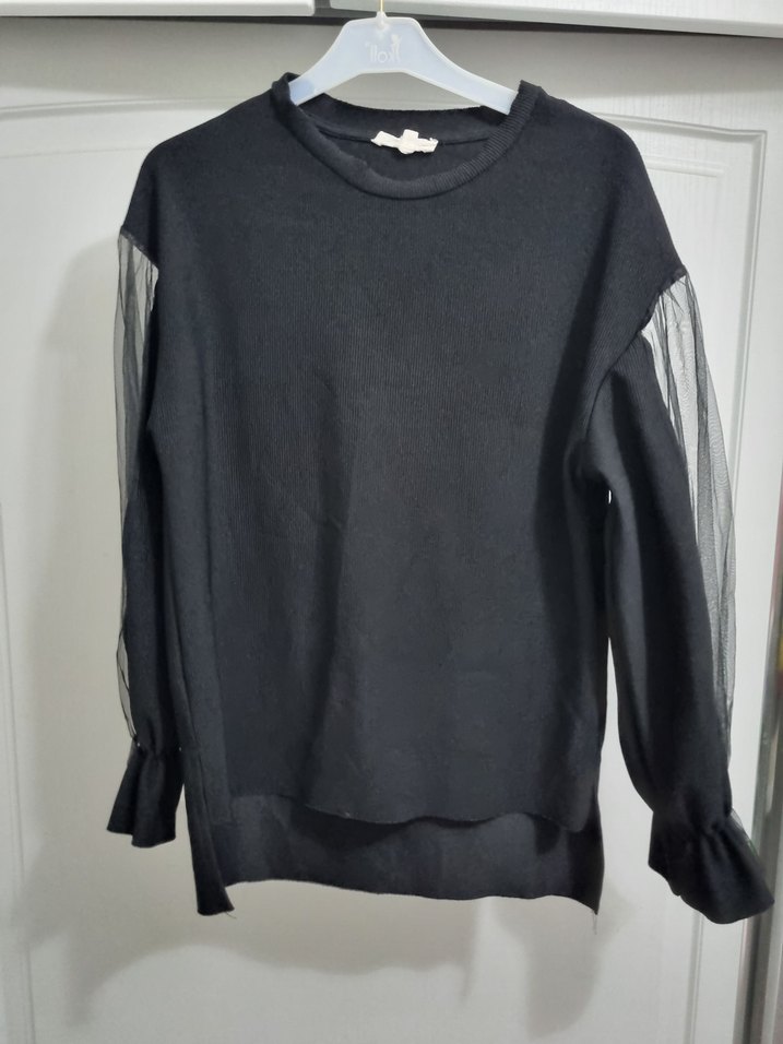 Siyah triko kumaştan yapılmış, uzun kollu ve transparan detaylı, yuvarlak yakalı, salaş kesim kadın bluz.