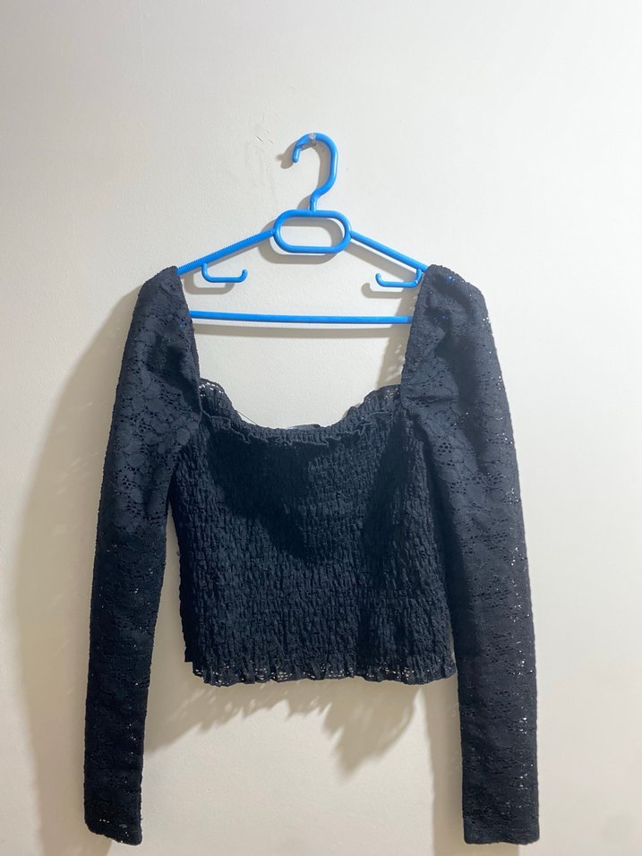 Siyah triko kumaştan yapılmış, uzun kollu ve straplez yakalı, normal midi boyda, dar kesim bir bluz.