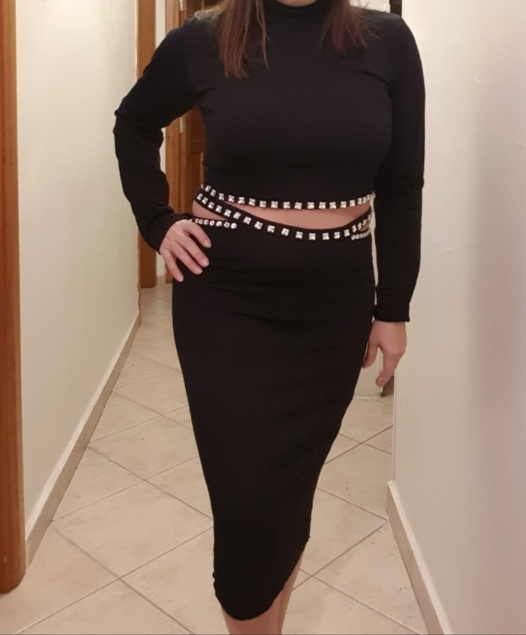 Siyah triko Yüksek Yakalı Kemerli Kalem kazak ve etek takım