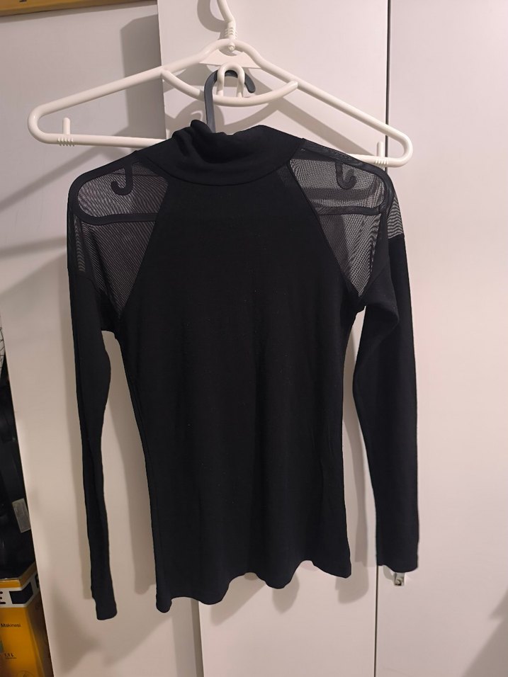 Boğazlı ve uzun kollu, omuzlarında tül detaylı siyah fitted bluz, goth ve athleisure tarzını birleştirir, zahmetsiz şıklık sunar.