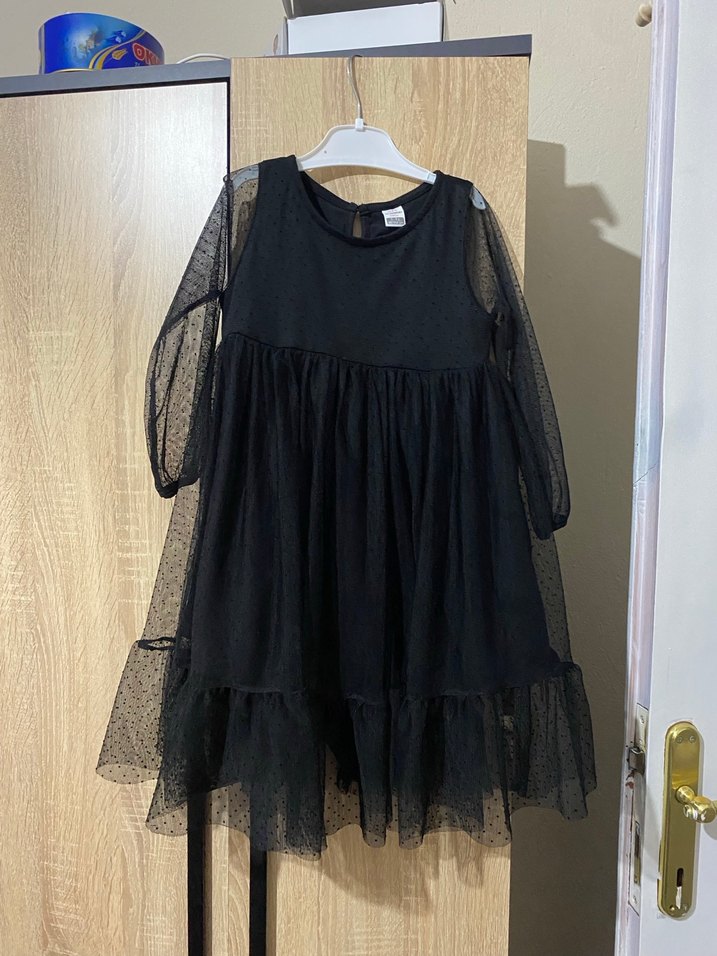 Siyah renkli , uzun tül kollu ve fırfırlı detaylara sahip, bol kesim kız elbisesi. Yuvarlak yaka ve desensiz tasarımı ile modern bir görünüme sahiptir.