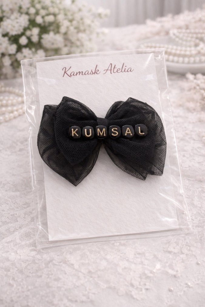Tül kumaştan yapılmış, siyah tül fiyonk saç aksesuarı. İstenen isim yazilir