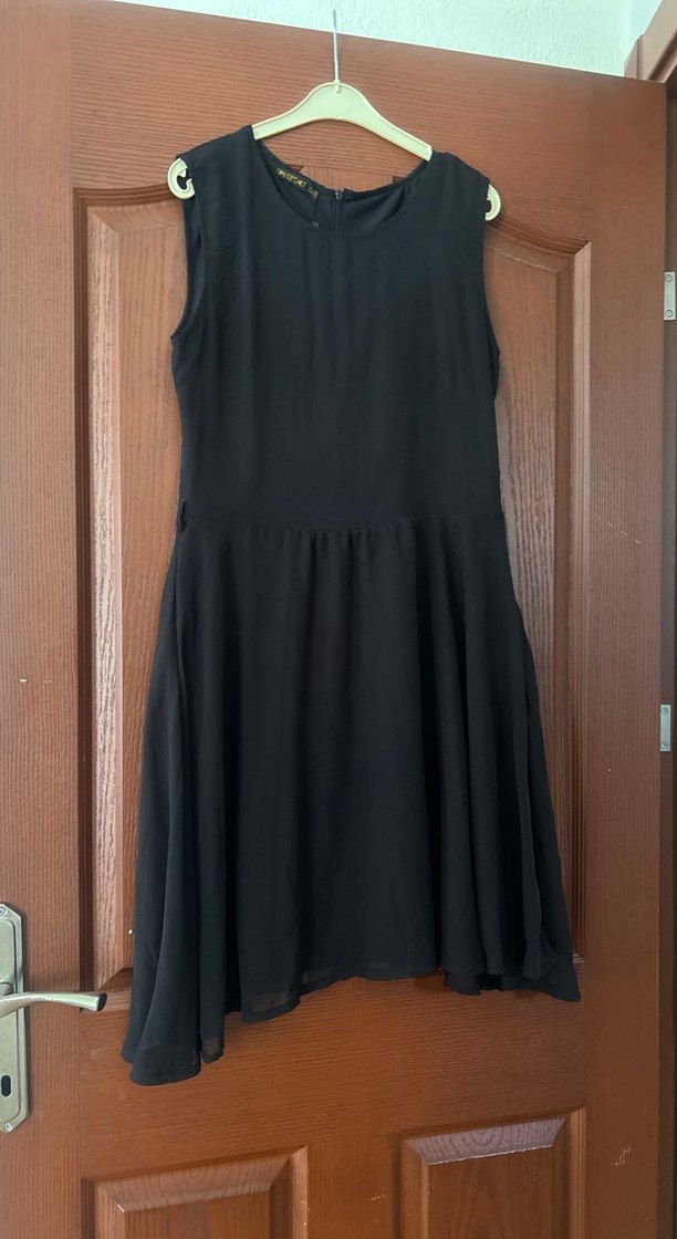 Siyah, kolsuz elbise, bol kesim detaylara sahiptir. desensiz ve minimalist gotik stile uygundur.