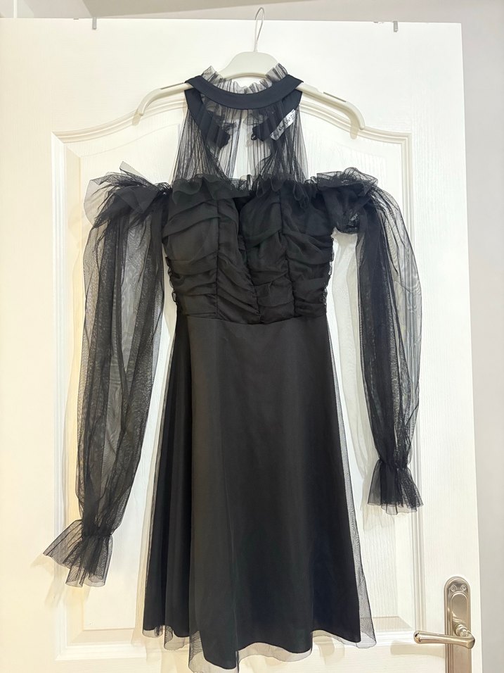M beden için uygundur siyah tül detaylı Boğazdan bağlı omuzdan bağlı romantik bir elbise sadece 1 2 kez kullanıldı tertemizdir.