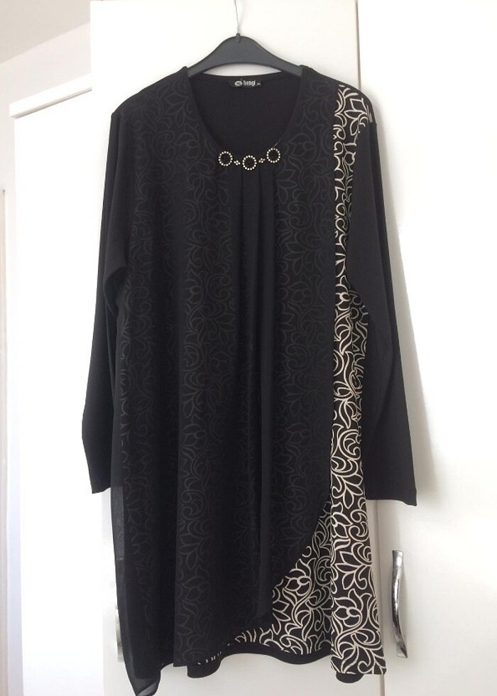 Tülün altında deseni vardır. Yaka kısmında güllü detaylar vardır. Boy 80 cm, iki koltukaltı arası 50 cm dir. Tesettür giyim için harika bir tunik sadece bir kere giyildi tertemiz. ☺️#tunik #düğme #desenli