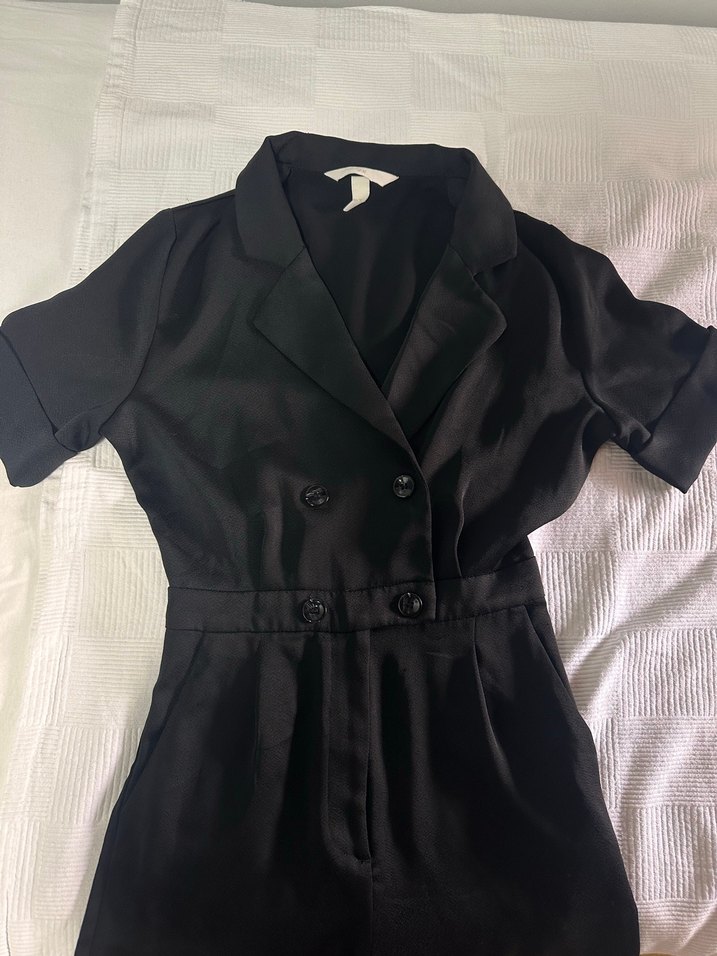 Düğmeli, kısa kollu, yakalı ve siyah uzun boy tulum. İpeksi kumaştan, iş ortamına uygun tarzda şık bir model.