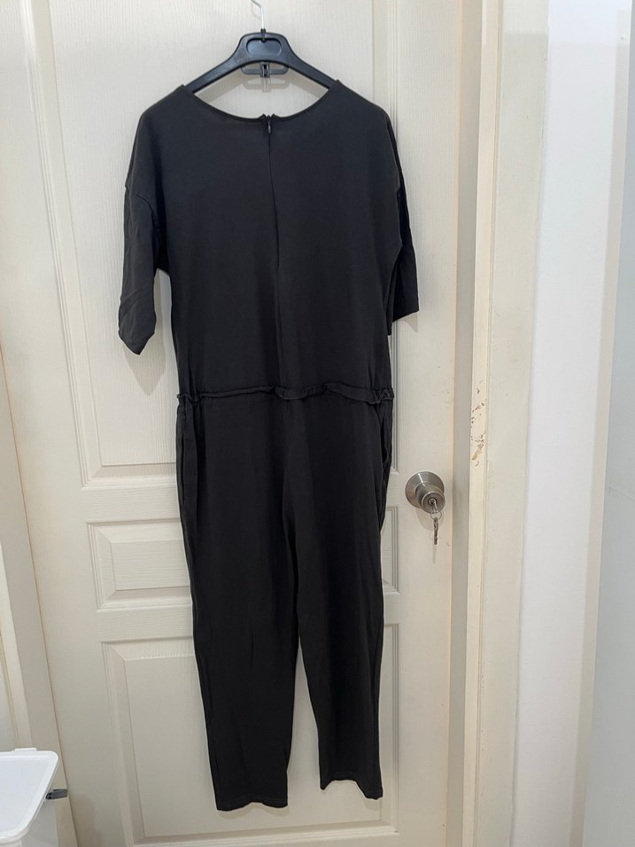 Siyah kumaştan, rahat kesim, kısa kollu ve bisiklet yaka midi tulum. Günlük kullanıma uygun sade ve şık tasarım.