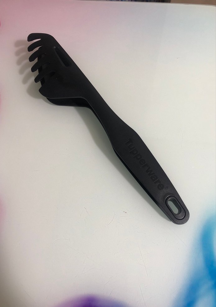 Dayanıklı plastikten yapılmış siyah Tupperware makarna maşası, kolay tutuş ve servis için uygundur. Askı için deliği vardır. Herhangi bir problemi yok kullanılmıştır ama çok fazla değil şu an kullanmadığım için satıyorum isterseniz birleştirip maşa olarak isterseniz ayırıp salata için kullanın çok amaçlıdır