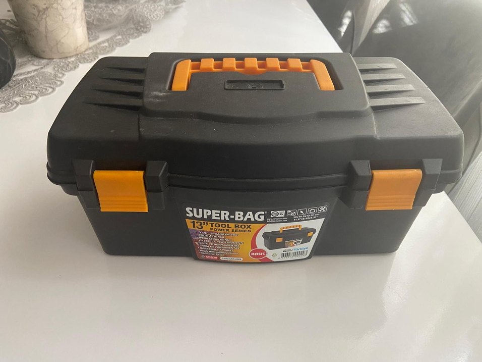 Siyah ve turuncu renklerde 13 inçlik alet kutusu, sağlam sap ve güvenli kilitlerle düzenli saklama sağlar. Super-Bag Power Serisi ürünüdür.