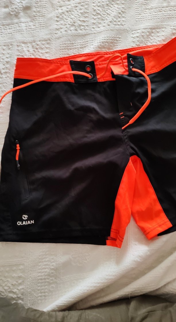 OLAIAN markalı, siyah ve turuncu renkli, fermuarlı cep detaylı, fit kesim erkek mini mayo. Sokak tarzı ve athleisure etkisiyle dış mekan kullanımı için uygundur.