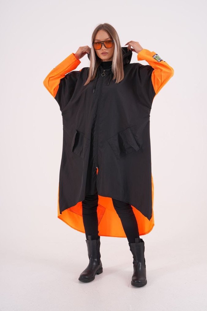 Siyah Turuncu Uzun Salaş Street Style Yağmurluk