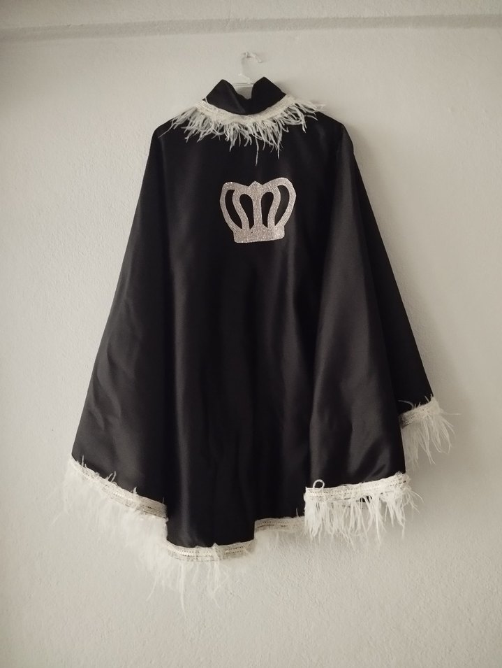 Siyah, kolsuz çocuk pelerini yüksek yakalı ve bol kesimdir. Parlak işlemeli taç ve yakada ile uçlarda tüy detayları bulunur. Pelerin 3 numara Şapka 5 numaradır 1 saat kullanılmıştır