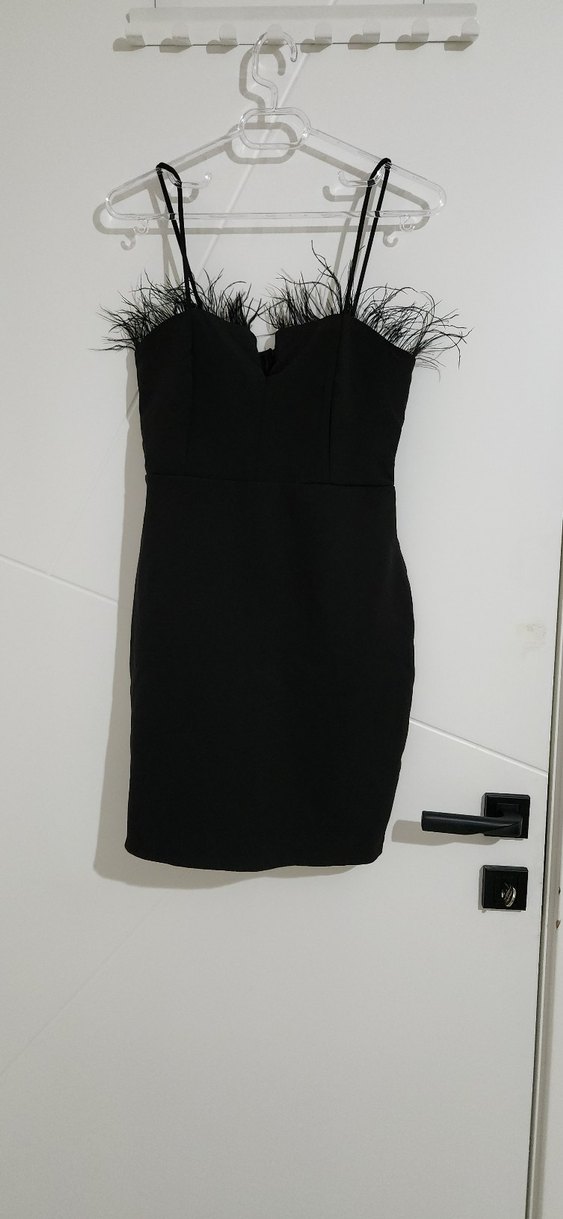 Siyah Tüy Detaylı Midi Siyah Elbise