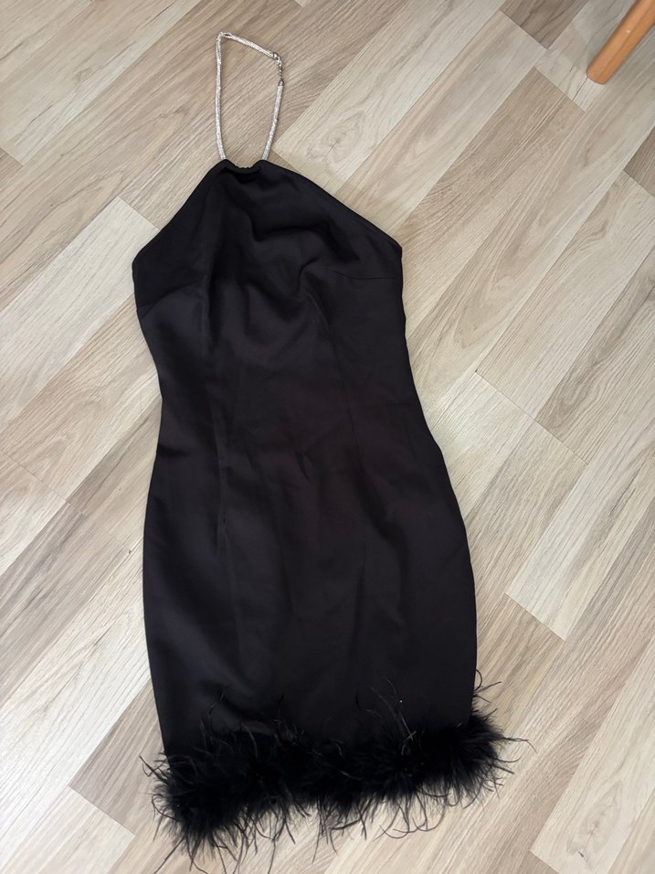 Siyah, uzun ve vücuda oturan abiye elbise, halter yaka ve ip askılarla tasarlanmış, etek ucu tüy detaylıdır.