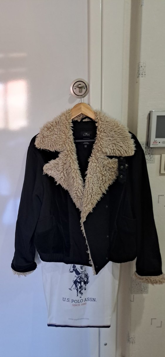 Siyah renkli, uzun kollu, bol kesim kadın ceket. Yaka ve manşetlerde yumuşak tüylü detaylar bulunur. Rahat ve gündelik tarz için uygundur.