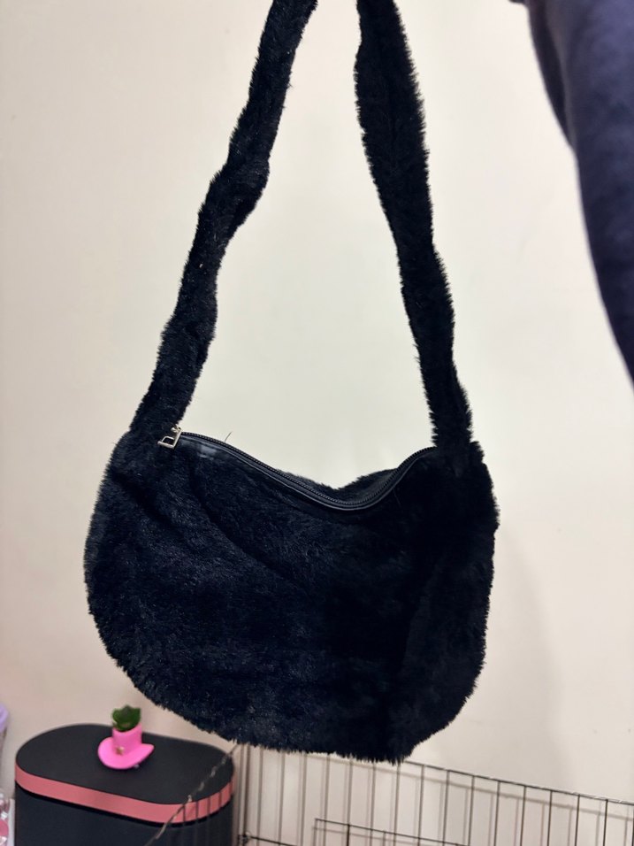 Siyah renkte, yumuşak ve sıcak tüylü dokulu kadın omuz çantası. Fermuarlı, desen içermeyen tasarımıyla günlük kullanıma uygundur.