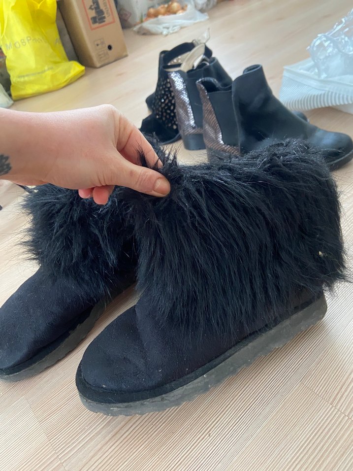 Siyah, tüylü detaylı ve stiletto topuklu kadın botları. Yumuşak ve sıcak hissettiren kumaştan yapılmıştır. Günlük kullanıma uygun, gotik tarzda.