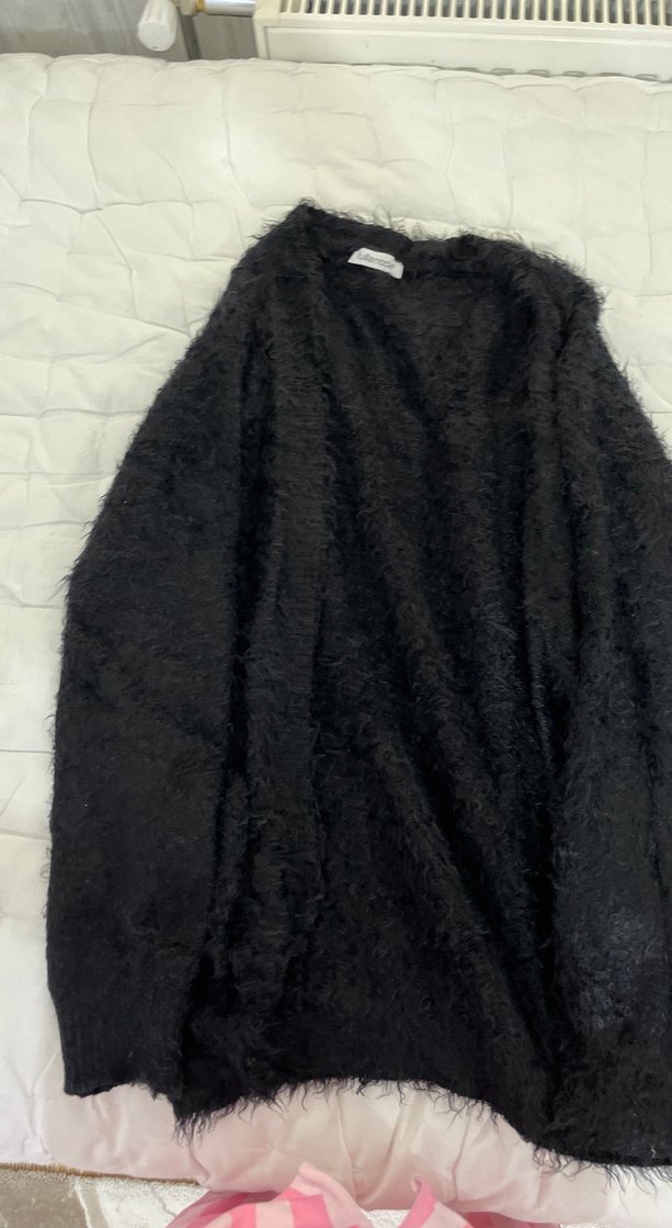 Siyah renk, uzun kollu, yuvarlak yaka, bol kesim ve tüylü dokulu yün kadın kazak.