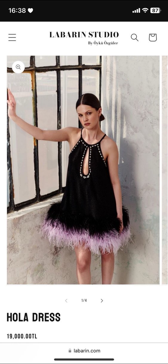 Siyah mini elbise, straplez ve ince askılı yakaya sahip. Nakış detayları ve bol kesimiyle, tüylü etek ucu parti için ideal avant-garde şıklık sunar.