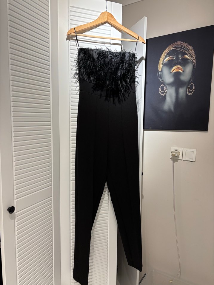 Siyah, tüylü detaylı, askısız ve fitted kesime sahip uzun tulum. Sentetik kumaştan olup, ofis için uygun şık bir siluete sahiptir. ✨